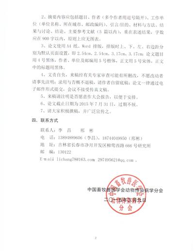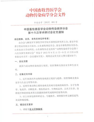 由公司承辦的中國畜牧獸醫學(xué)會(huì )動(dòng)物傳染病分會(huì )第十六次學(xué)術(shù)研討會(huì )征文通知